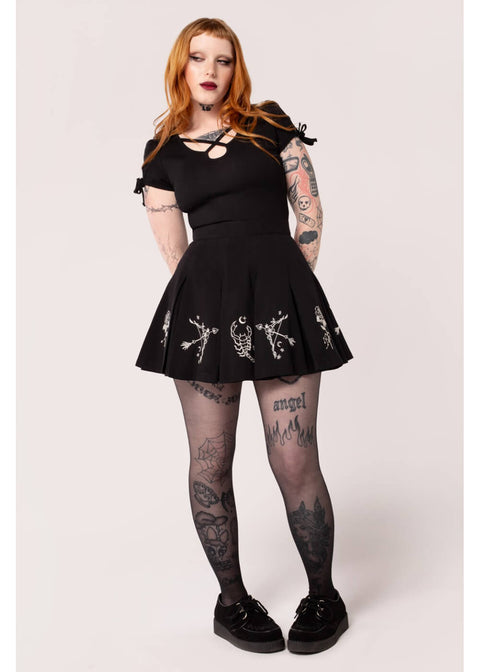 Wear, style, and combine like a star with this beautiful pleated skirt! Finding it here is no coincidence, as you two are clearly meant to be together. It's classic black, with stunning embroidered details at the bottom that clearly reflect your love for astrology. The archer's arrow hits you right in the heart!