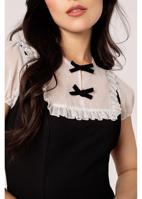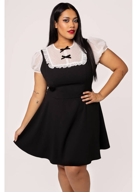 Who else but Hell Bunny brings you the perfect dress to chase after rabbits, chat with purple cats, and sip tea with queens? The white mesh adorned with white polka dots may appear deceptively innocent, while the shorter length adds a playful vibe that will make you want to Futterwacken. Transform your wardrobe into a Wonderland!