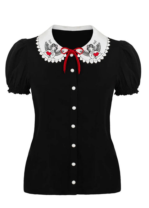 In black, white, and red, and totally Cupid-proof: the Cupid Blouse is the kind of top that immediately whispers “romance in retro”! The white collar with heart lace and those adorable cherubs? We've completely fallen for it! Whether it's Valentine's Day or any day of the year, you'll wear this cutie with love 🖤