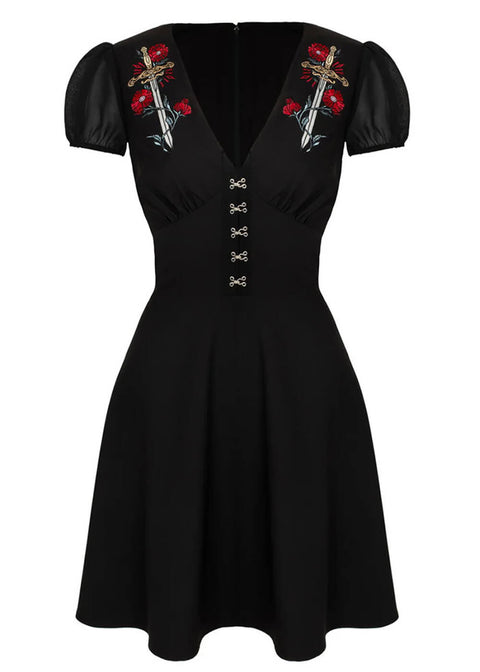 Black, flirty, and just a hint dangerous - Elyse is made for you! This beauty marries a classic fit & flare design with striking embroidery of swords and flowers. Perfect for retro romance with a dark edge 🗡️