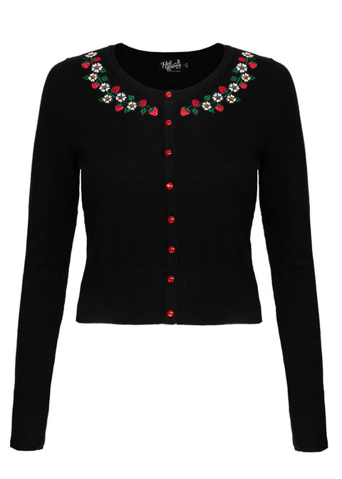The classic black base is lovely, but the embroidered strawberries and daisies along the neckline make it irresistibly cute. And those shiny red buttons? It's like placing a cherry on top of a cake!