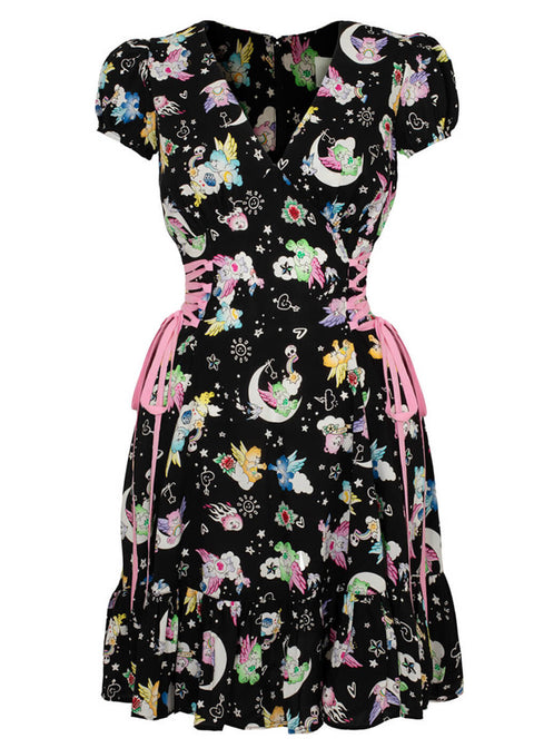 This dress mixes adorable Care Bears with rainbow-spewing skulls for a hefty dose of cute chaos, almost as if a tattoo flash sheet has come to life! The pink corset laces on the side make it stand out even more and add extra personality to this mini dress, totally you β₯